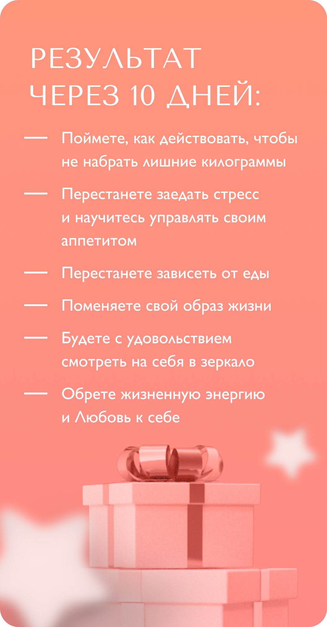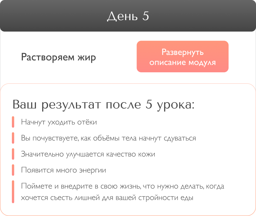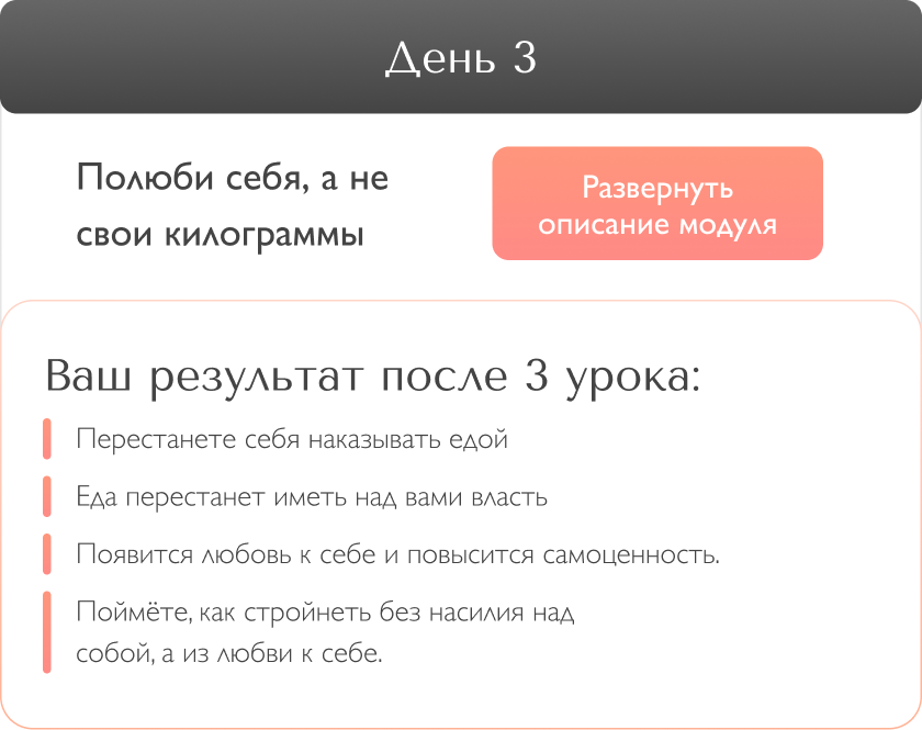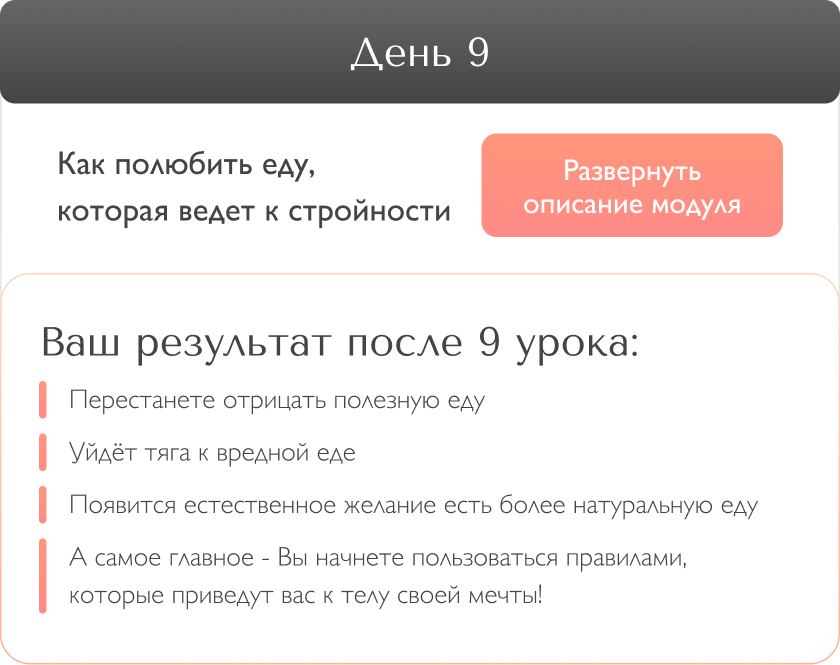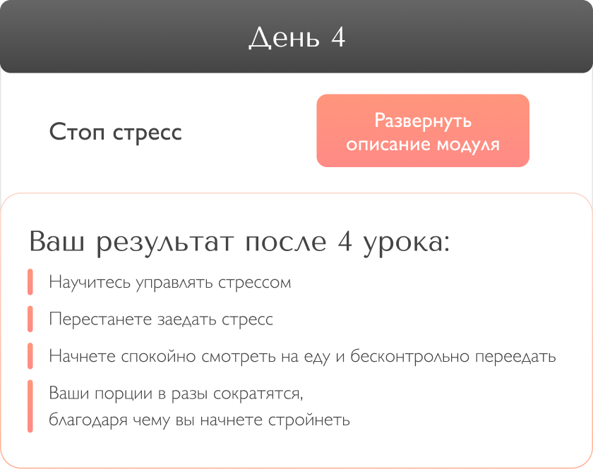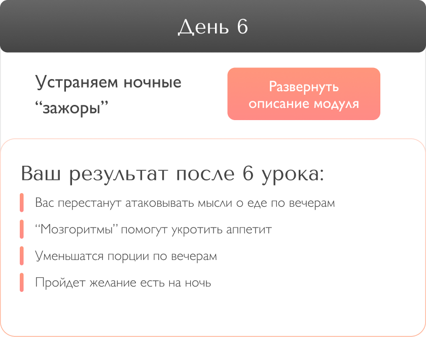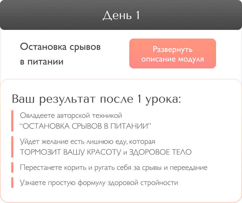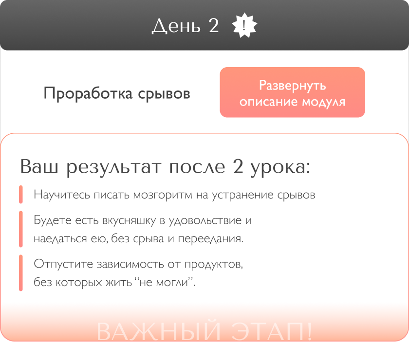 2 этап - очень важен! Вечером обещаете себе завтра есть меньше или вообще, сесть на диету, а завтра случается срыв. Вся жизнь - это сплошная череда ежедневных срывов и обещаний. И, как следствие, неуправляемый набор лишних кг. Знаете почему это происходит? Потому что Вы занимаетесь самодиагностикой и ограничениями, не знаю причин. Проработка при помощи “мозгоритмов”, исключает последующие срывы. А значит, вы легко двигаетесь к заветной стройности.